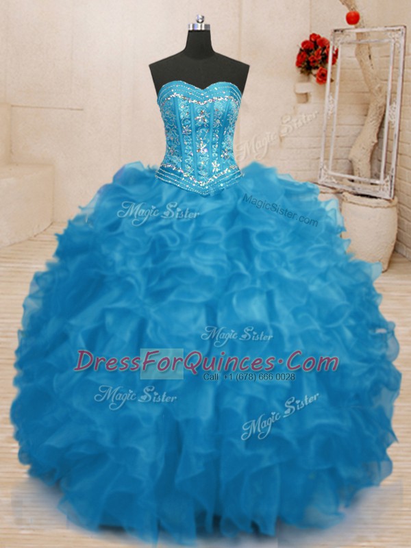 Fabulous Baby Blue Organza Lace Up Quinceanera Dresses Sleeveless Floor Length Beading and Ruffles