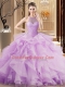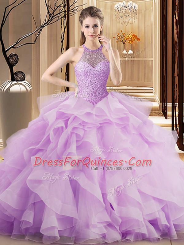 Fantastic Lilac Halter Top Lace Up Beading and Ruffles Sweet 16 Quinceanera Dress Brush Train Sleeveless