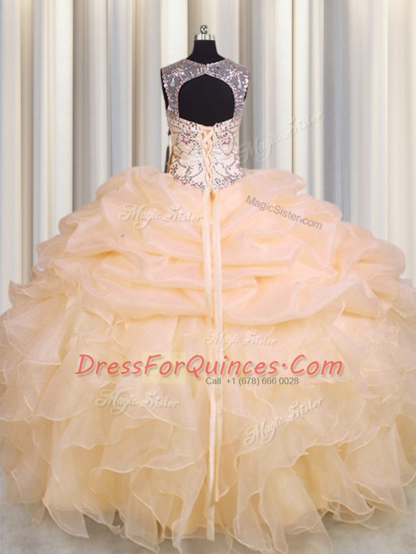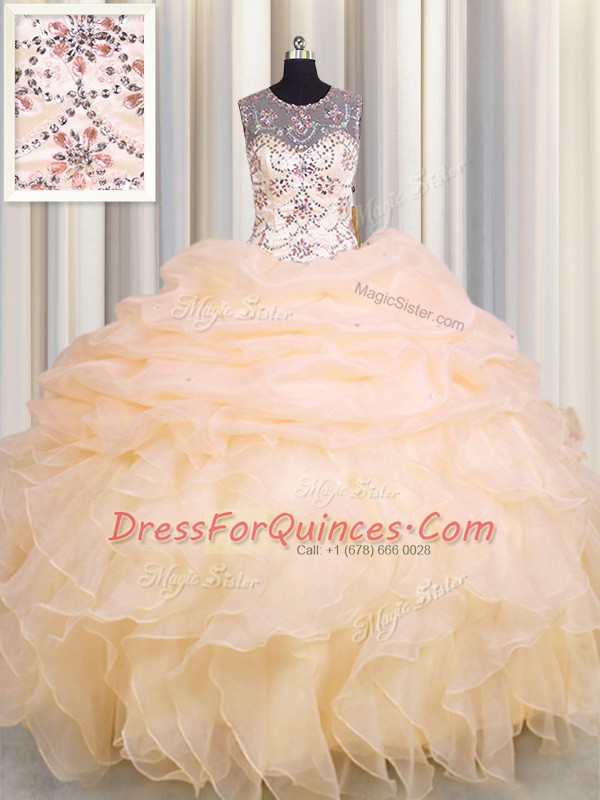 Fashion Scoop See Through Sleeveless Floor Length Beading and Ruffles and Pick Ups Lace Up 15 Quinceanera Dress with Peach