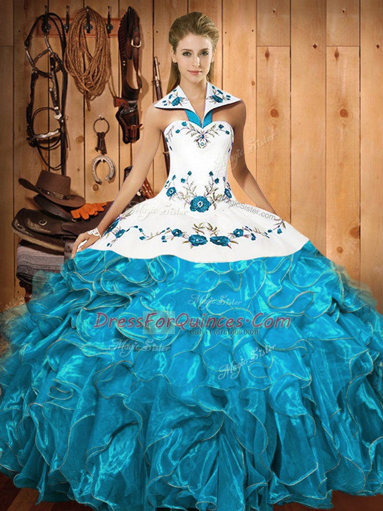 Flirting Baby Blue Lace Up 15 Quinceanera Dress Embroidery and Ruffles Sleeveless Floor Length