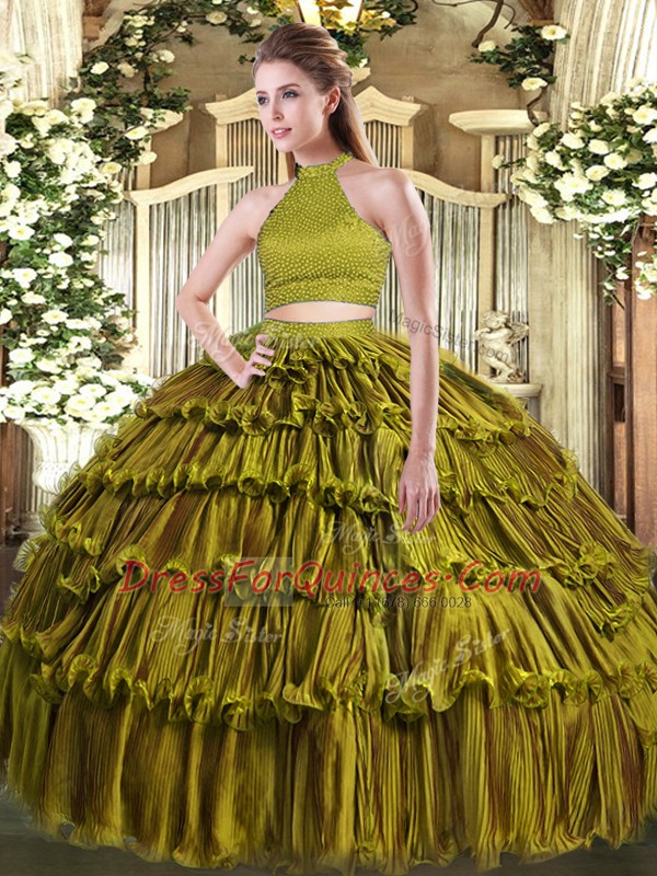 Floor Length Olive Green Quinceanera Dresses Halter Top Sleeveless Backless