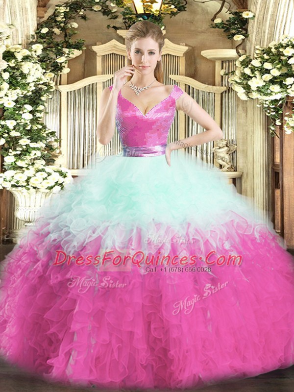 Floor Length Zipper 15 Quinceanera Dress Multi-color for Military Ball and Sweet 16 and Quinceanera with Ruffles