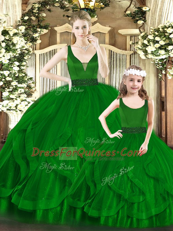 Green 15th Birthday Dress Military Ball and Sweet 16 and Quinceanera with Beading and Ruffles V-neck Sleeveless Zipper