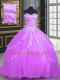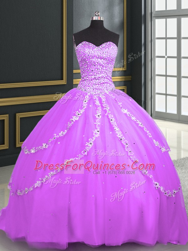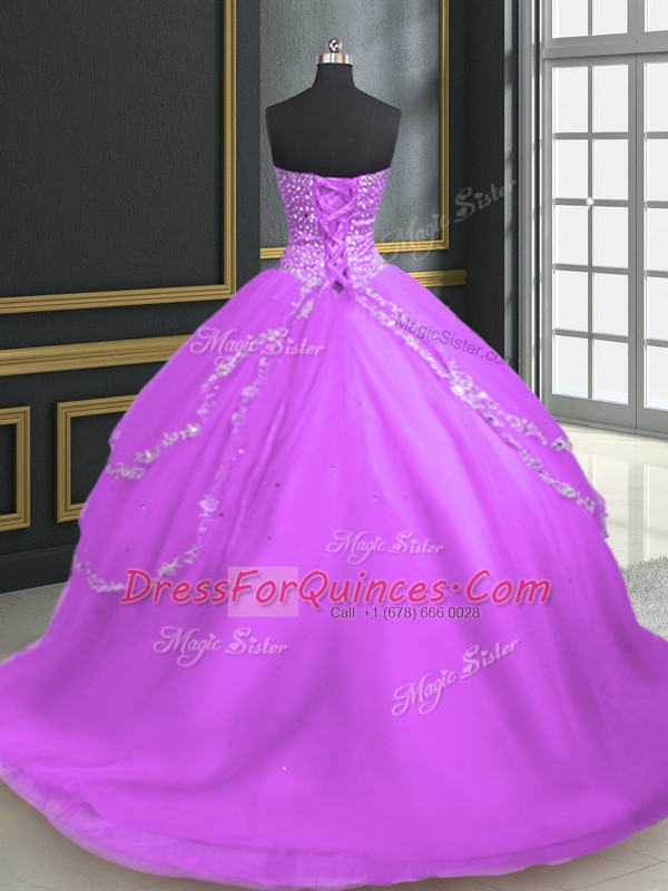 Lilac Tulle Lace Up Quinceanera Gown Sleeveless With Brush Train Beading and Appliques