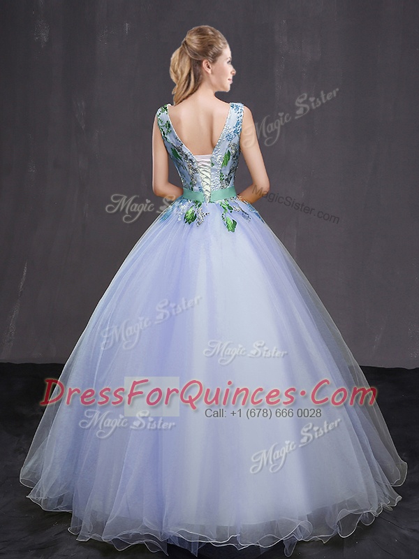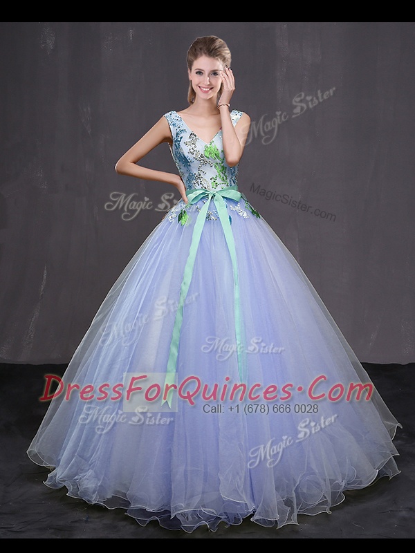 Luxury Lavender Lace Up Appliques and Belt Quince Ball Gowns Tulle Sleeveless