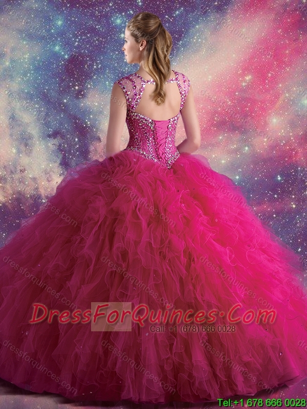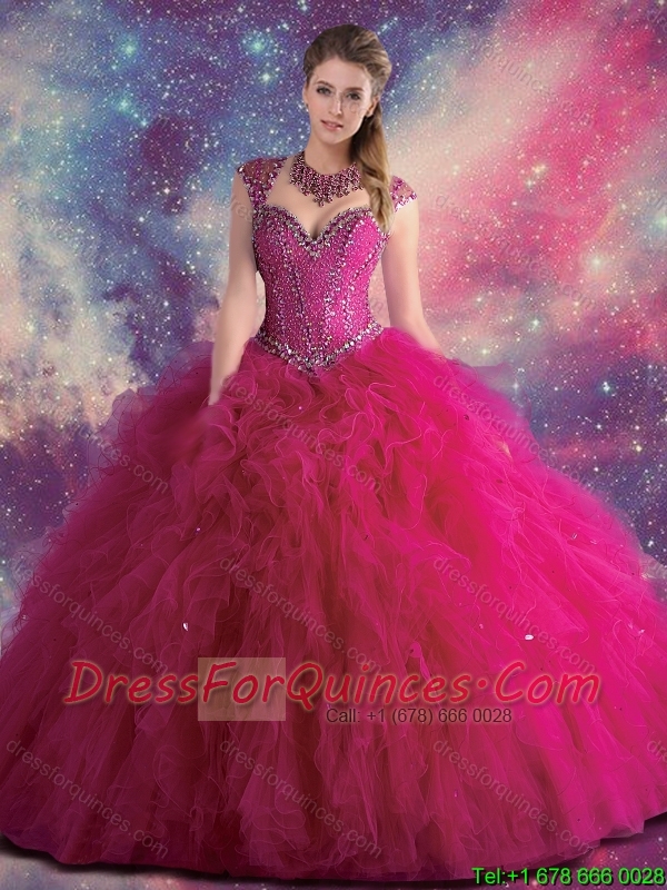 Perfect Straps Beaded and Ruffles Quinceanera Gowns in Fuchsia