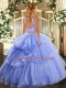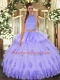 Sophisticated Lavender Backless Halter Top Beading and Appliques and Ruffles Ball Gown Prom Dress Tulle Sleeveless