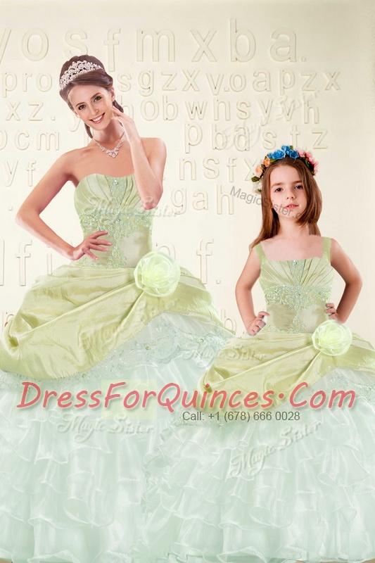 Top Selling Yellow Green Ball Gowns Organza and Taffeta Sweetheart Sleeveless Beading and Ruffled Layers and Hand Made Flower Floor Length Lace Up Sweet 16 Dresses