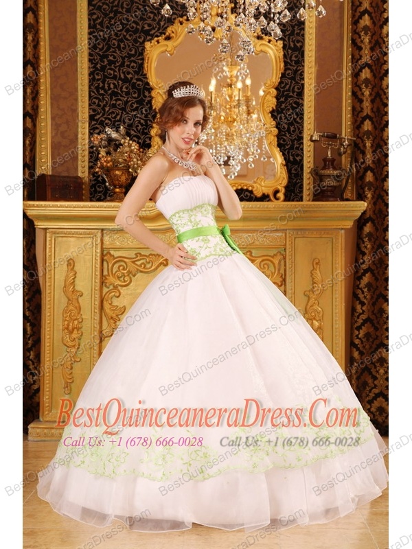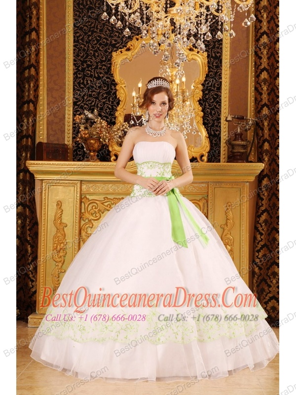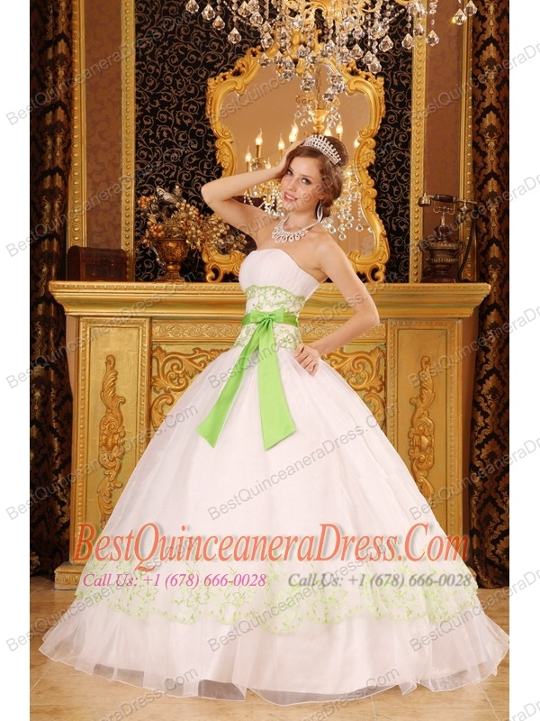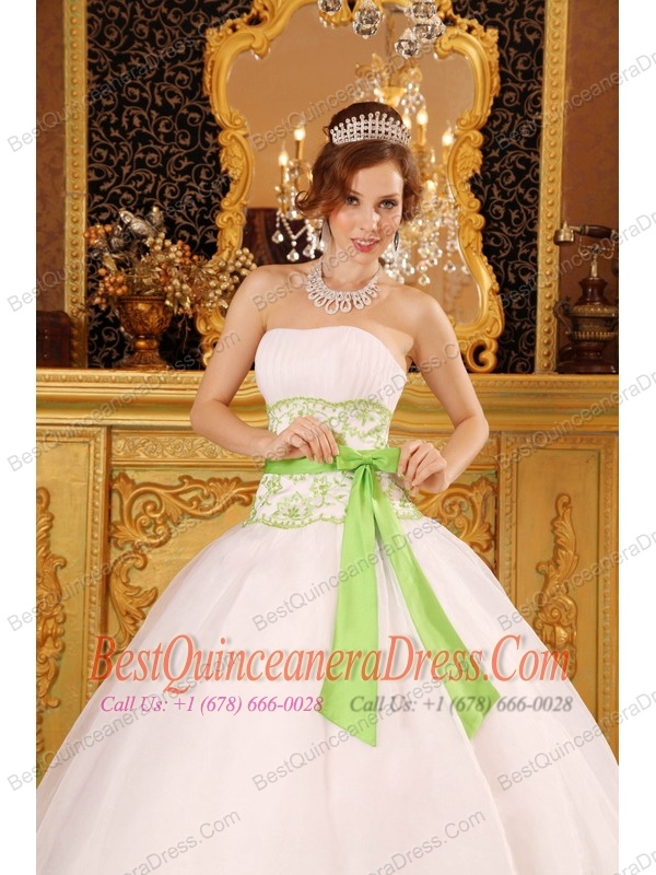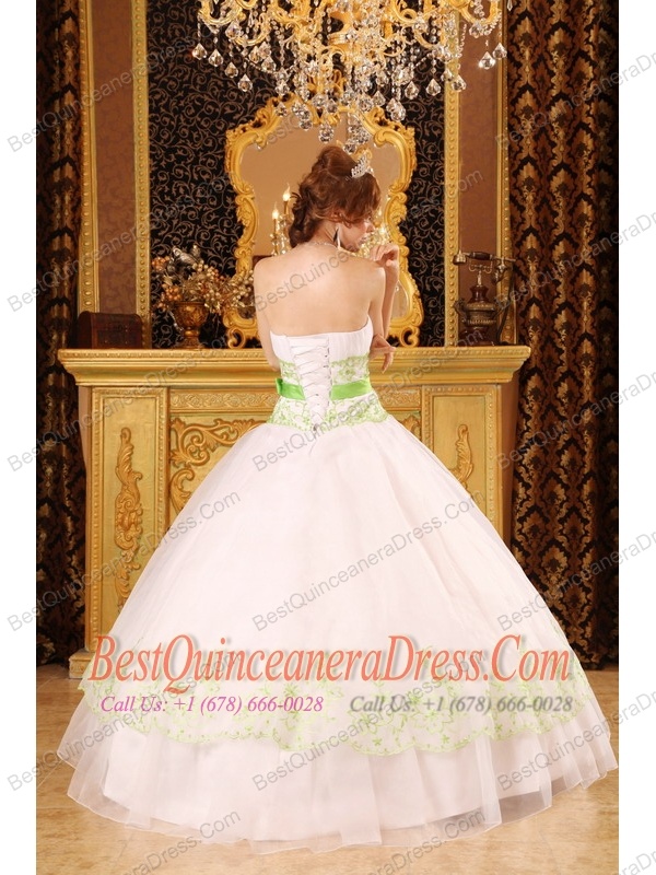 White Ball Gown Strapless Floor-length Organza and Taffeta Appliques Quinceanera Dress