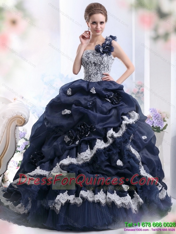 Best 2015 One Shoulder Ruffles Quinceanera Dresses with Hand Made Flowers and Pick Ups