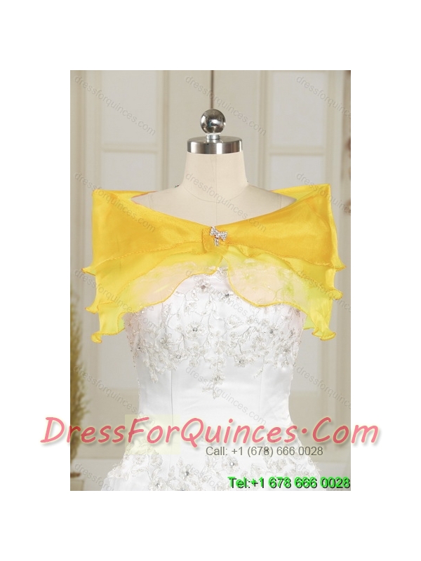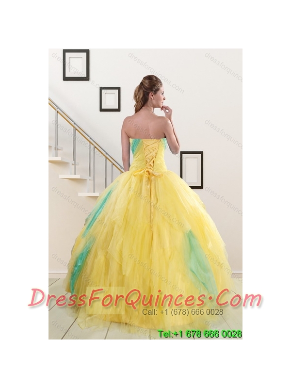 Best 2015 Strapless Yellow and Green Sweet 15 Dresses with Ruching