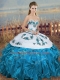Chic Organza Sweetheart Sleeveless Lace Up Embroidery and Ruffles and Bowknot Quinceanera Gowns in Blue And White