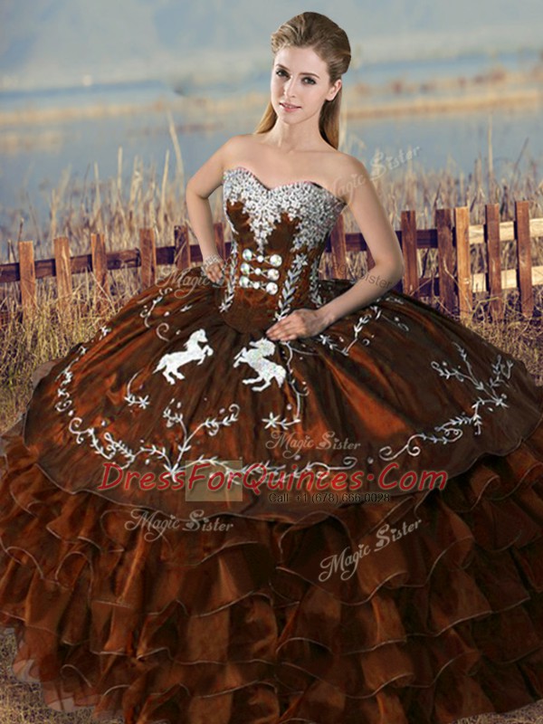 Custom Made Sleeveless Satin and Organza Floor Length Lace Up Vestidos de Quinceanera in Brown with Embroidery and Ruffles