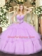 Decent Lavender Tulle Lace Up 15th Birthday Dress Sleeveless Floor Length Beading and Ruffled Layers