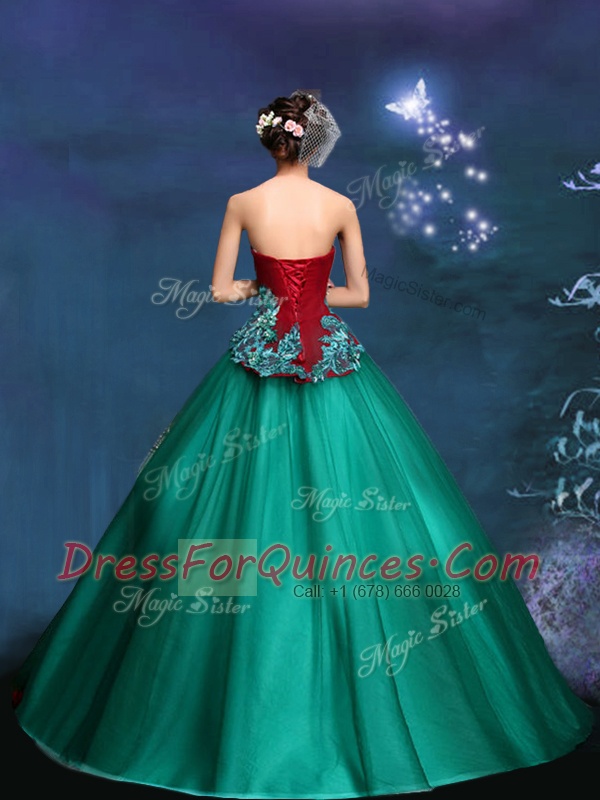Flirting Dark Green Lace Up Strapless Appliques Sweet 16 Quinceanera Dress Satin and Tulle Sleeveless