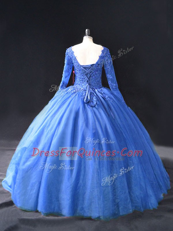Floor Length Blue 15 Quinceanera Dress V-neck Long Sleeves Lace Up