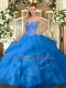 Floor Length Lace Up Ball Gown Prom Dress Blue for Military Ball and Sweet 16 and Quinceanera with Appliques and Ruffles