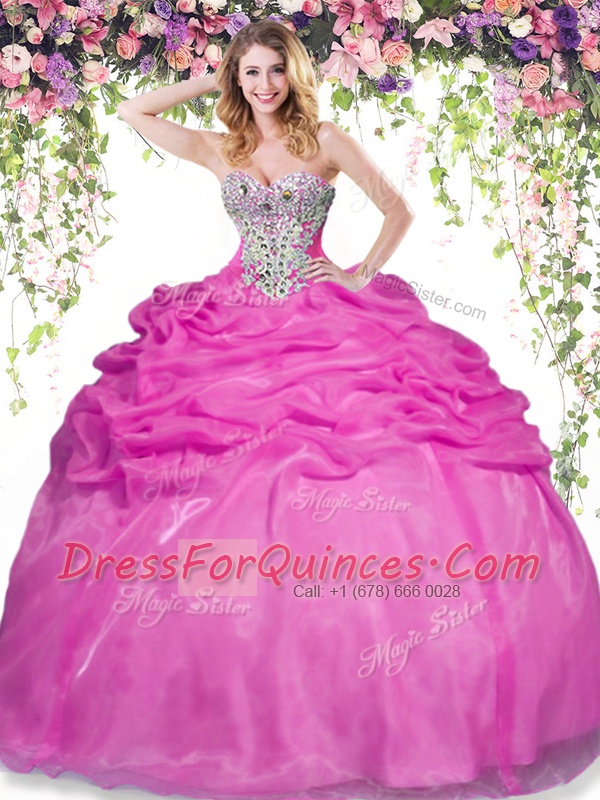Free and Easy Hot Pink Lace Up Quince Ball Gowns Beading and Pick Ups Sleeveless Floor Length