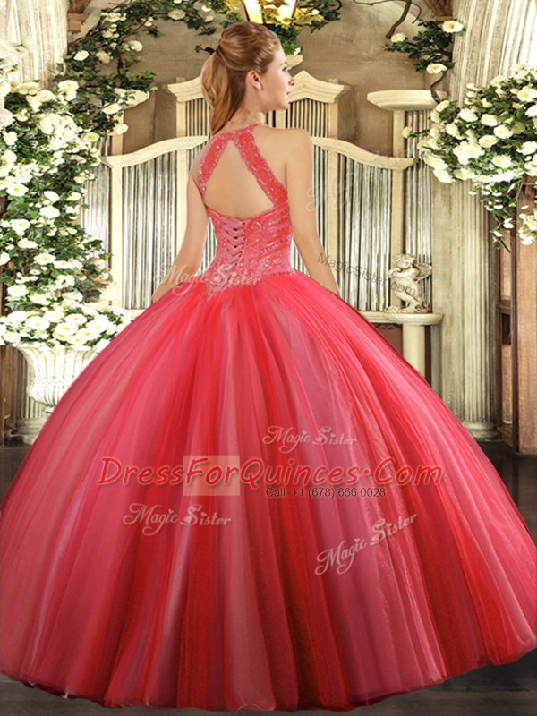 Fuchsia Lace Up High-neck Beading Quince Ball Gowns Tulle Sleeveless