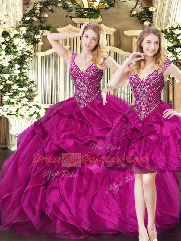 Fuchsia Three Pieces Organza V-neck Sleeveless Ruffles Floor Length Lace Up Sweet 16 Dress