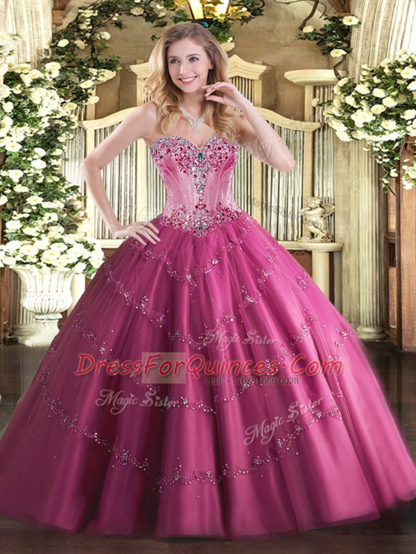 Fuchsia Tulle Lace Up Ball Gown Prom Dress Sleeveless Floor Length Beading