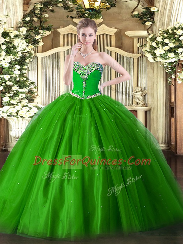 Green Tulle Lace Up Sweetheart Sleeveless Floor Length Ball Gown Prom Dress Beading