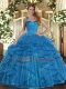 Halter Top Sleeveless Ball Gown Prom Dress Floor Length Ruffles Teal Tulle