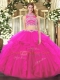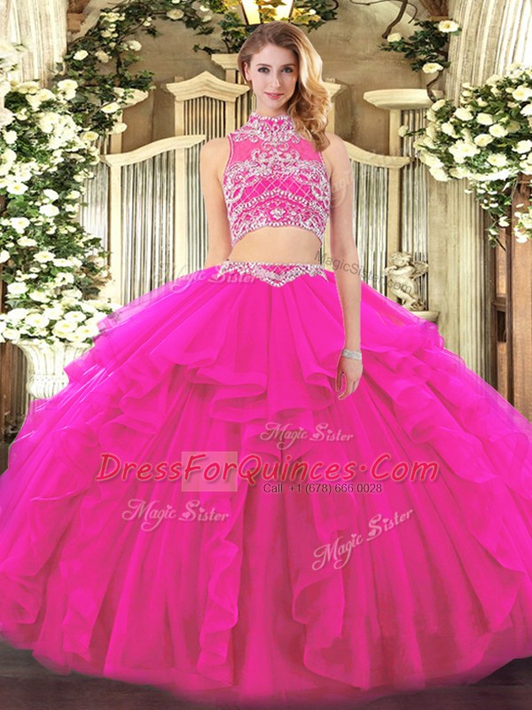 High-neck Sleeveless Backless Sweet 16 Dress Fuchsia Tulle