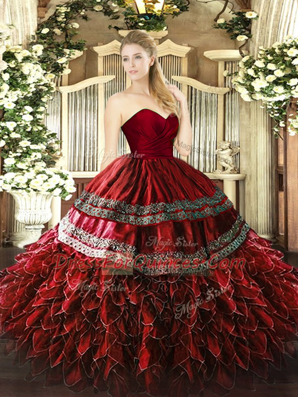Hot Sale Wine Red Sleeveless Floor Length Embroidery and Ruffles Zipper Quince Ball Gowns