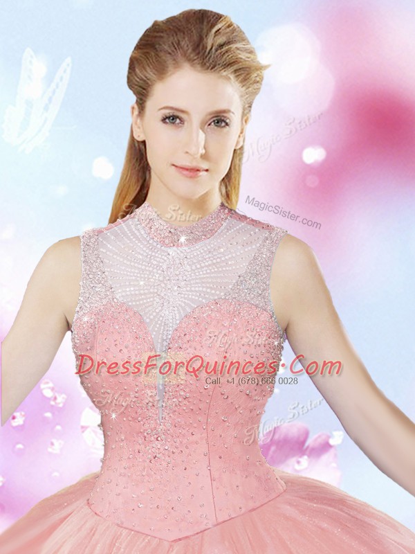 Latest Watermelon Red Sweet 16 Dresses Military Ball and Sweet 16 and Quinceanera and For with Beading High-neck Sleeveless Lace Up