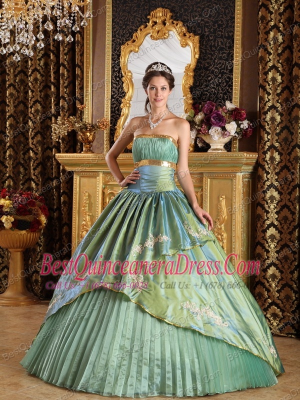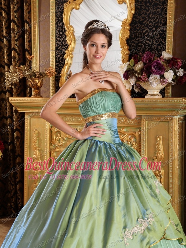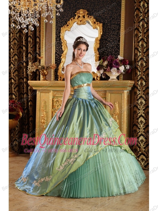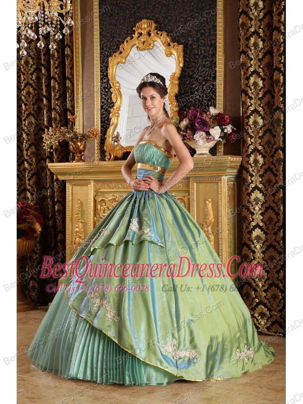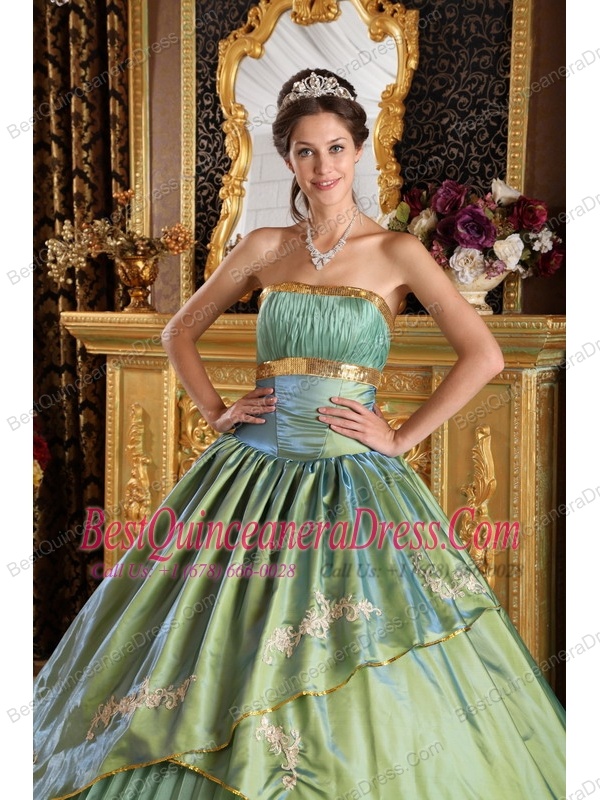 Olive Green Ball Gown Strapless Floor-length Taffeta and Organza Appliques Quinceanera Dress