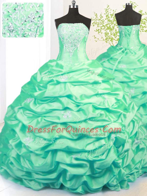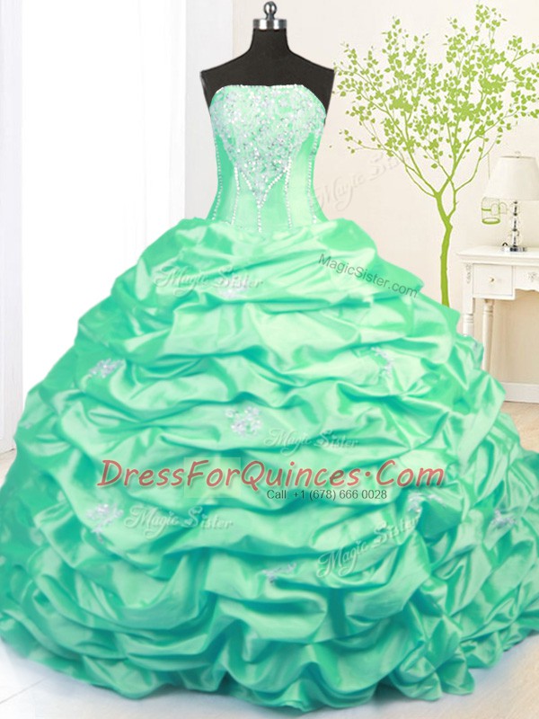 Pick Ups Sweep Train Ball Gowns Quinceanera Dress Turquoise Strapless Taffeta Sleeveless With Train Side Zipper