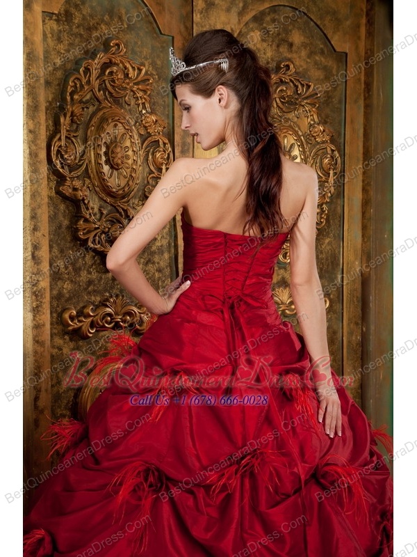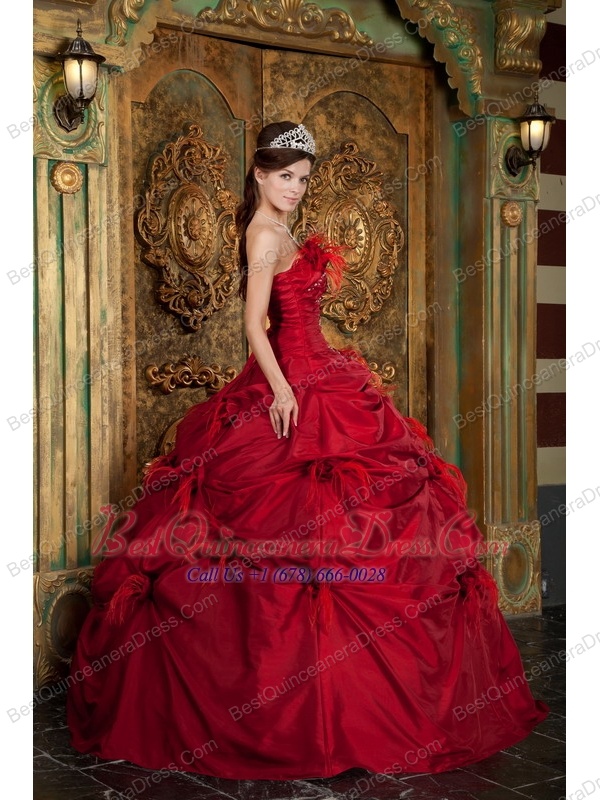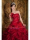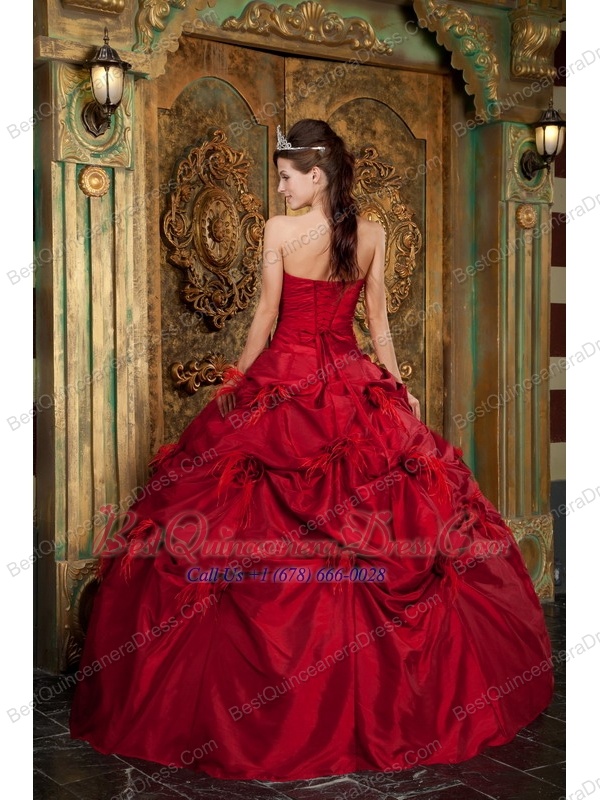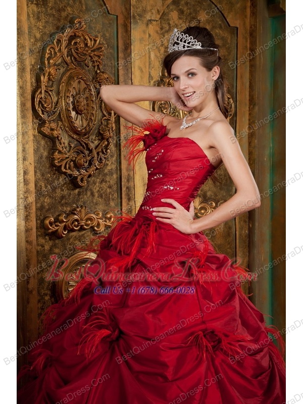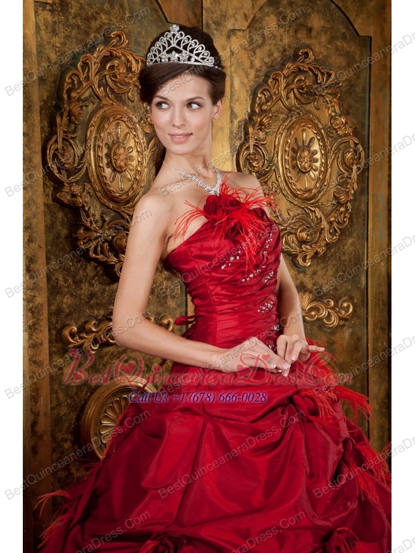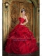 Red Ball Gown Strapless Floor-length Taffeta Hand Made Flowers Quinceanera Dress