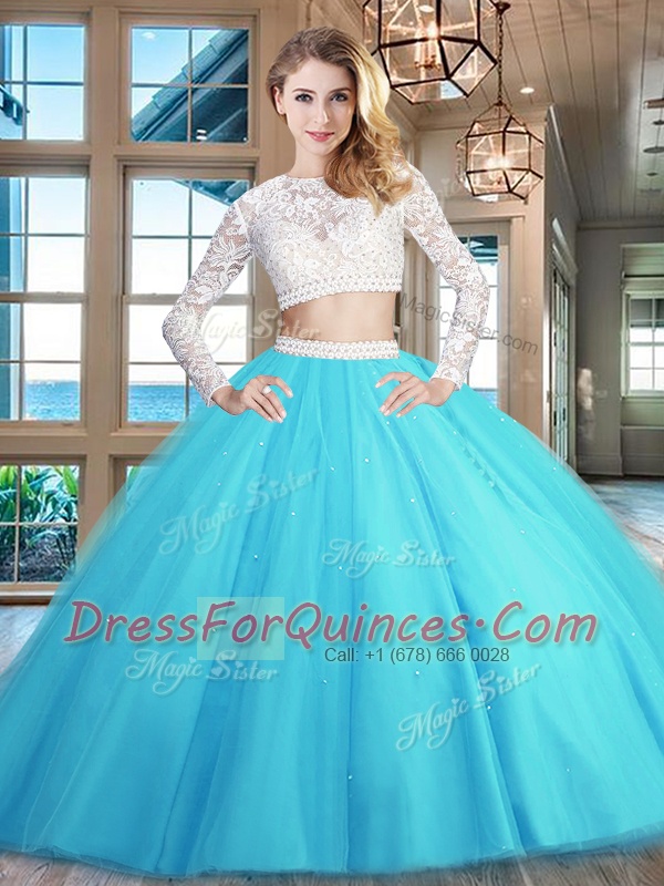 Scoop Baby Blue Two Pieces Beading and Lace Sweet 16 Dress Zipper Tulle Long Sleeves Floor Length