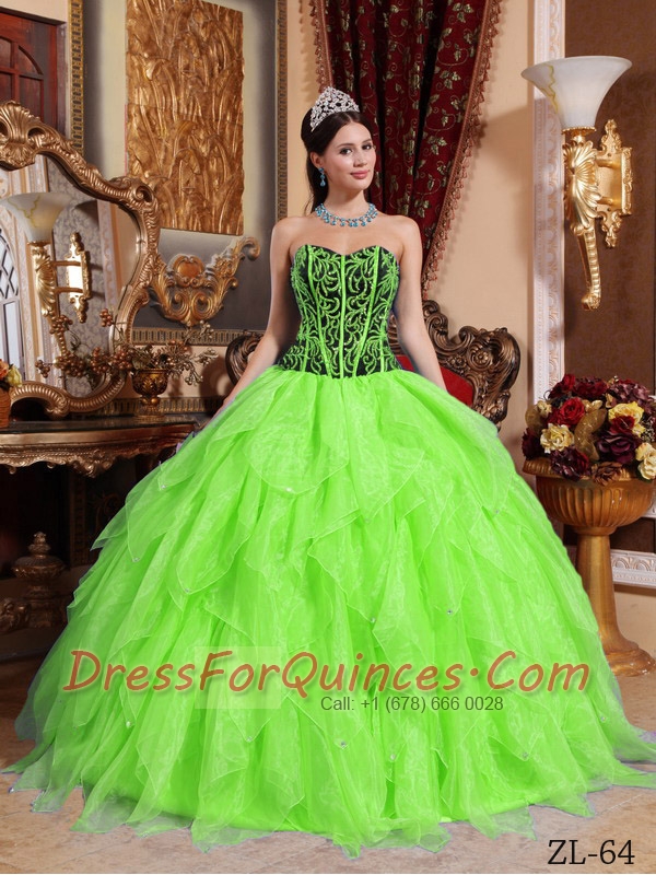 Spring Green Black Embroidery with Beading Ruffles Sweetheart Ball Gown Organza Best Quinceanera Dresses