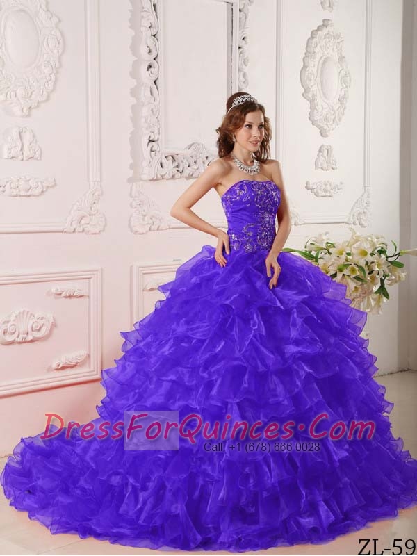 Strapless Ruffles Embroidery Ball Gown Purple Organza