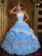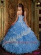 Strapless Sweetheart Ball Gown Appliques Ruffles Organza Aqua Blue Best Quinceanera Dresses