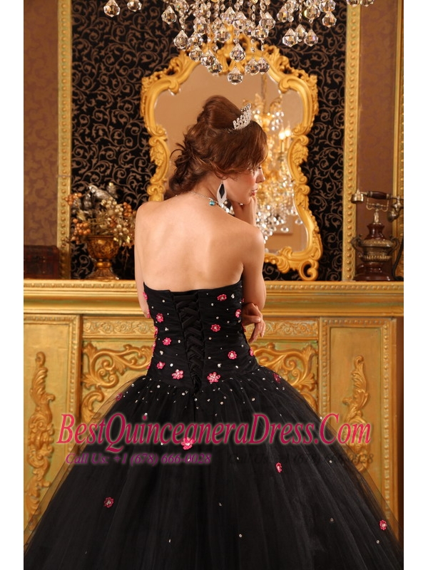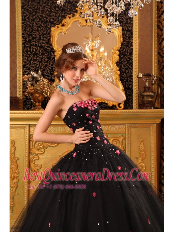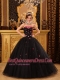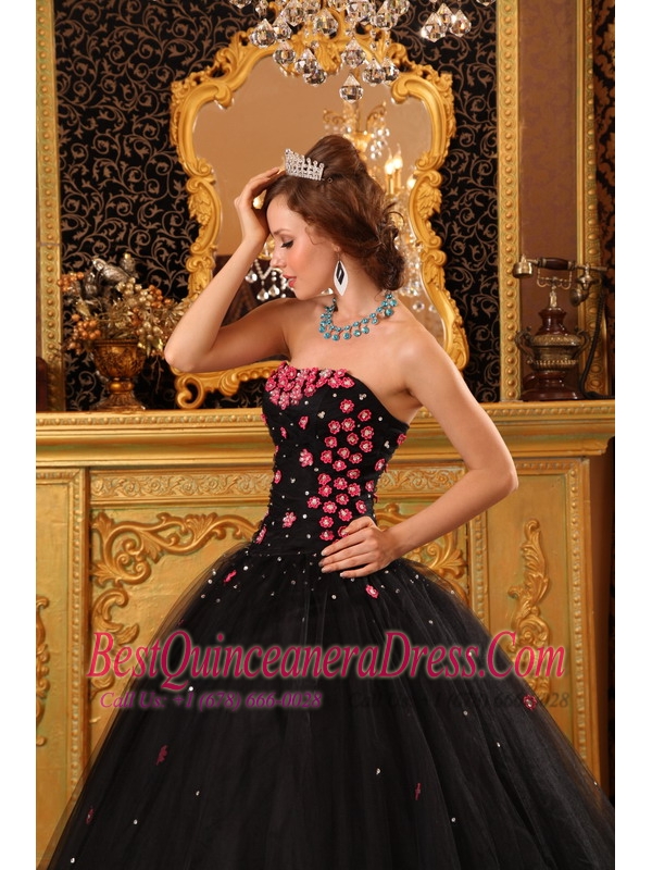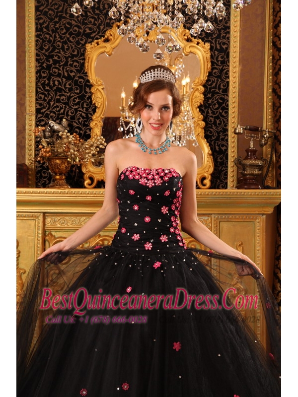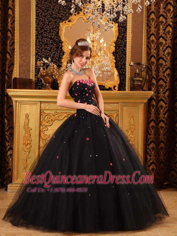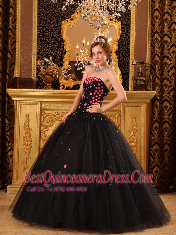 Black Ball Gown Strapless Floor-length Tulle Appliques Quinceanera Dress