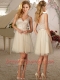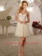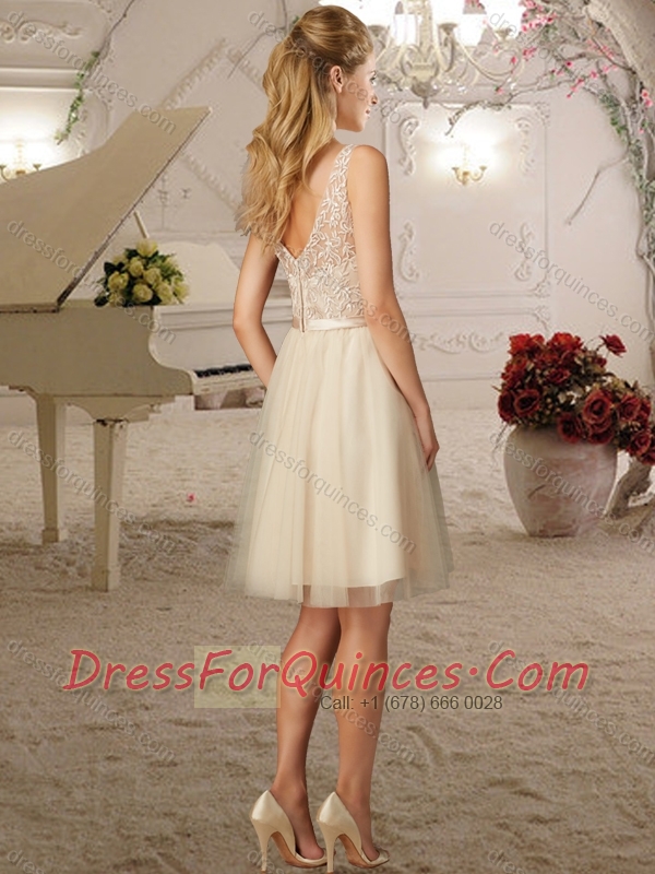 Cheap Fashionable Deep V Neck Champagne Short Dama Dress with Appliques