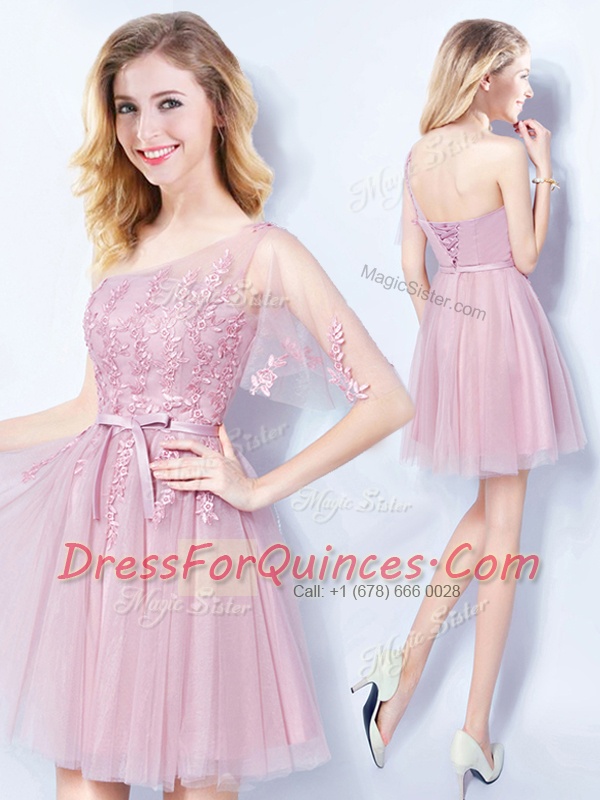 Clearance Pink Neckline Appliques and Belt Court Dresses for Sweet 16 Sleeveless Lace Up