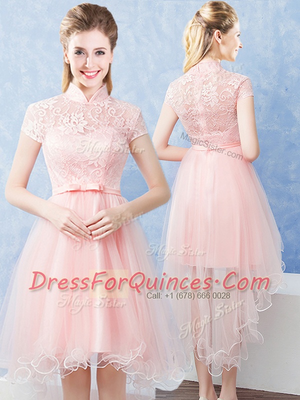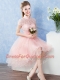 Custom Design Short Sleeves Tulle High Low Zipper Dama Dress for Quinceanera in Baby Pink with Lace and Belt