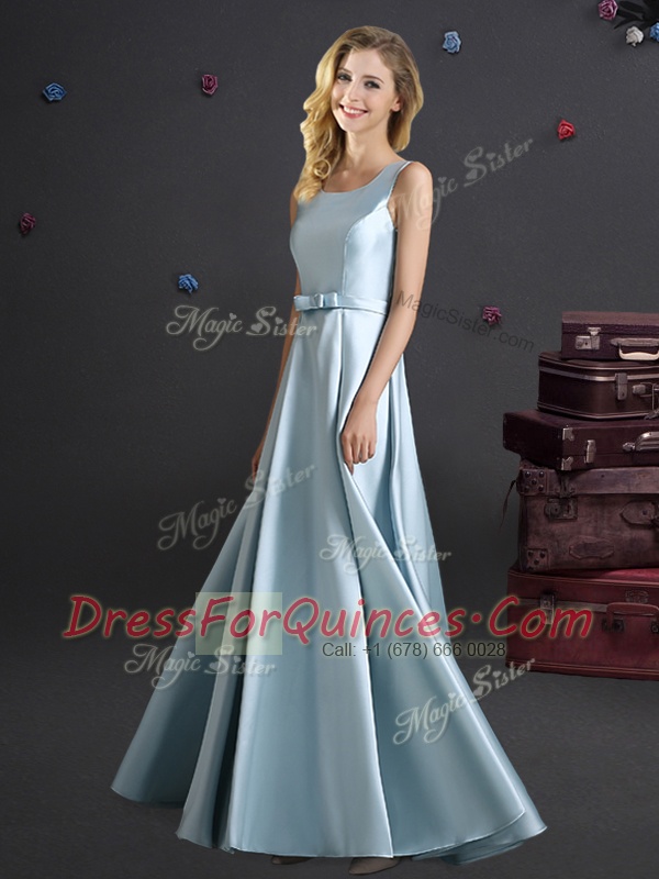 Customized Square Light Blue Elastic Woven Satin Zipper Damas Dress Sleeveless Floor Length Bowknot