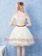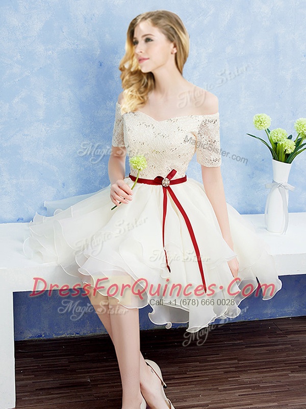 Delicate Off The Shoulder Short Sleeves Court Dresses for Sweet 16 Mini Length Lace and Ruffles and Belt Champagne Organza