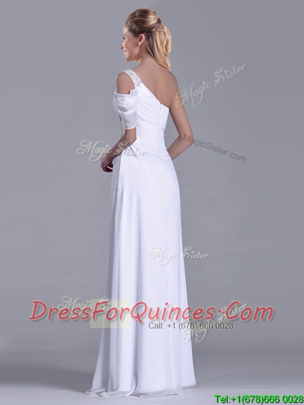 Fashionable Empire One Shoulder Beaded White Long White Dama Dress for Holiday