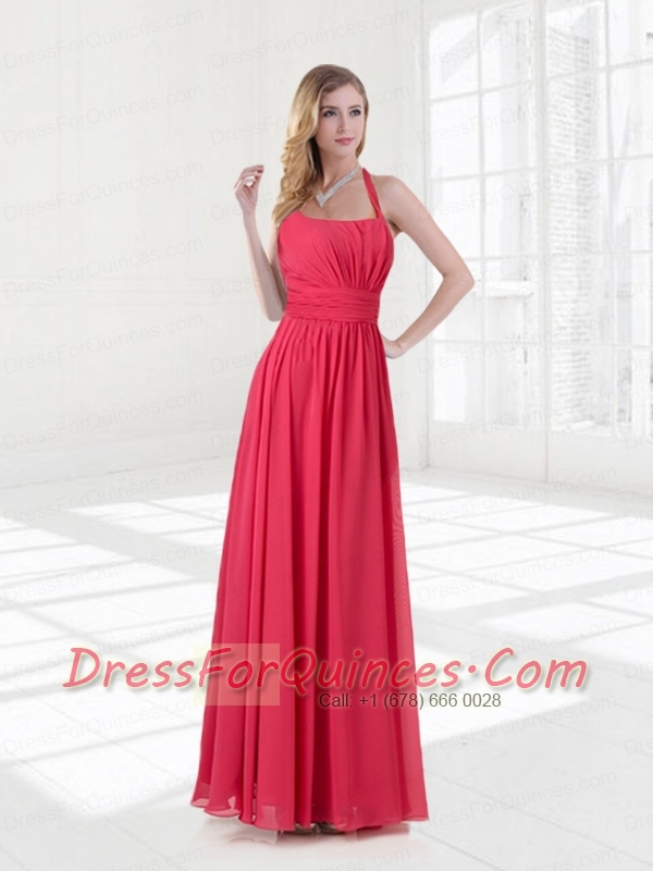 Halter Empire 2015 Coral Red Dama Dresses with Ruching