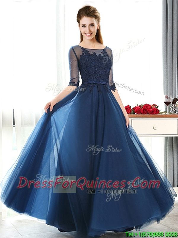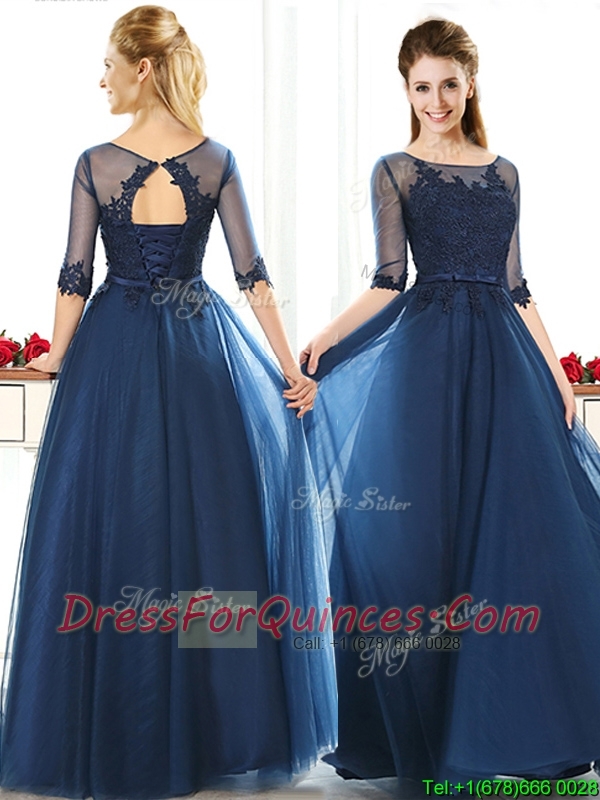 Luxurious See Through Scoop Half Sleeves Dama Dresses with Lace and Belt