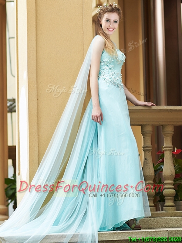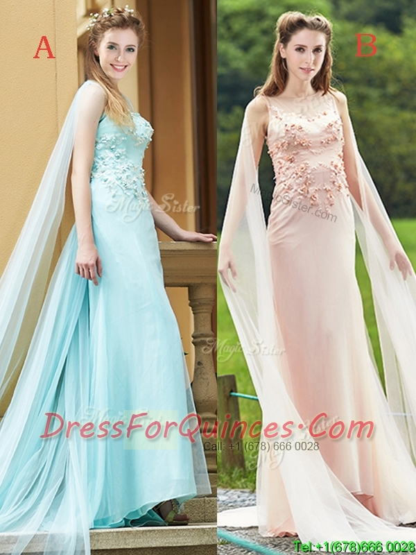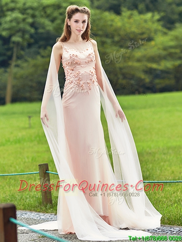 Modern Bateau Applique Decorated Bodice Dama Dresses with Watteau Train