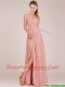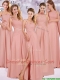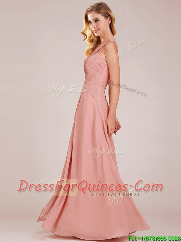 Modern Straps Peach Dama Dresses with Ruching and High Slit