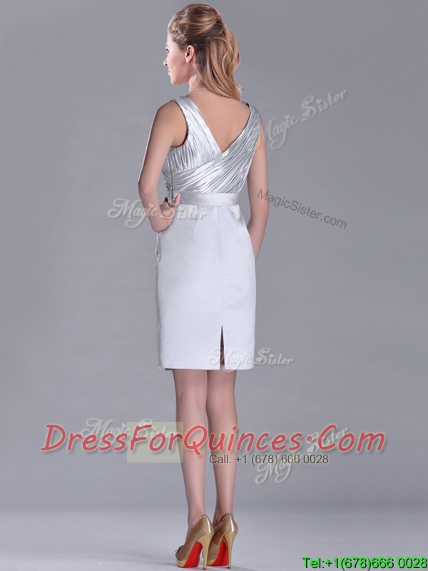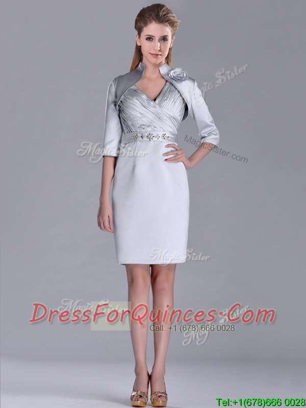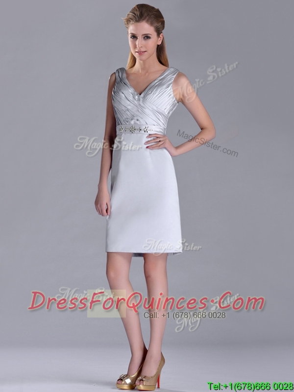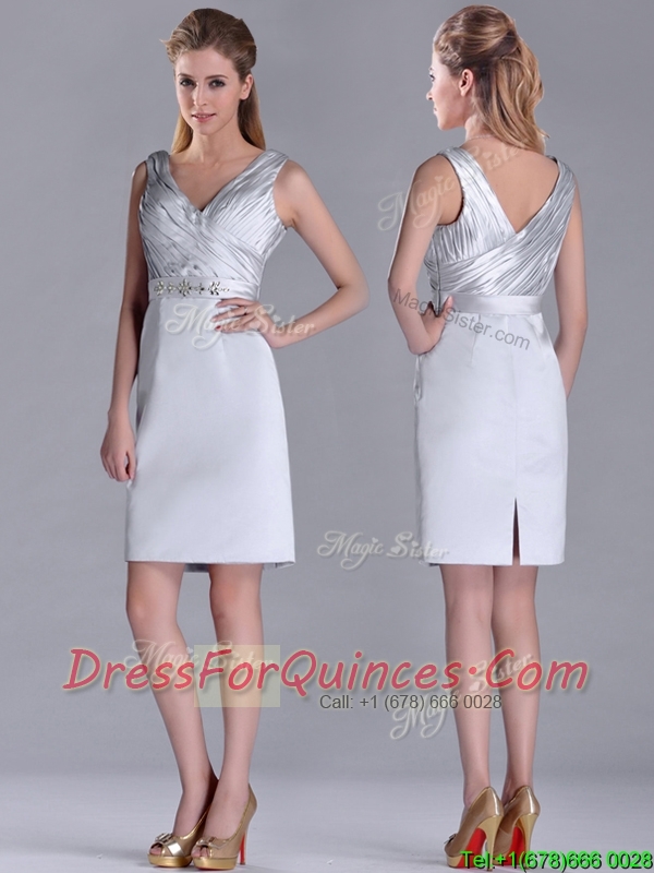 Modern V Neck Belted with Beading Dama Dress in Silver