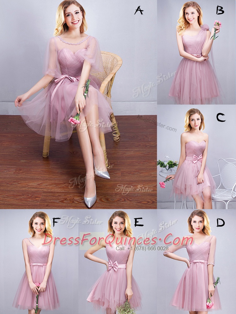 Pink Sleeveless Ruffles and Ruching and Bowknot Mini Length Damas Dress